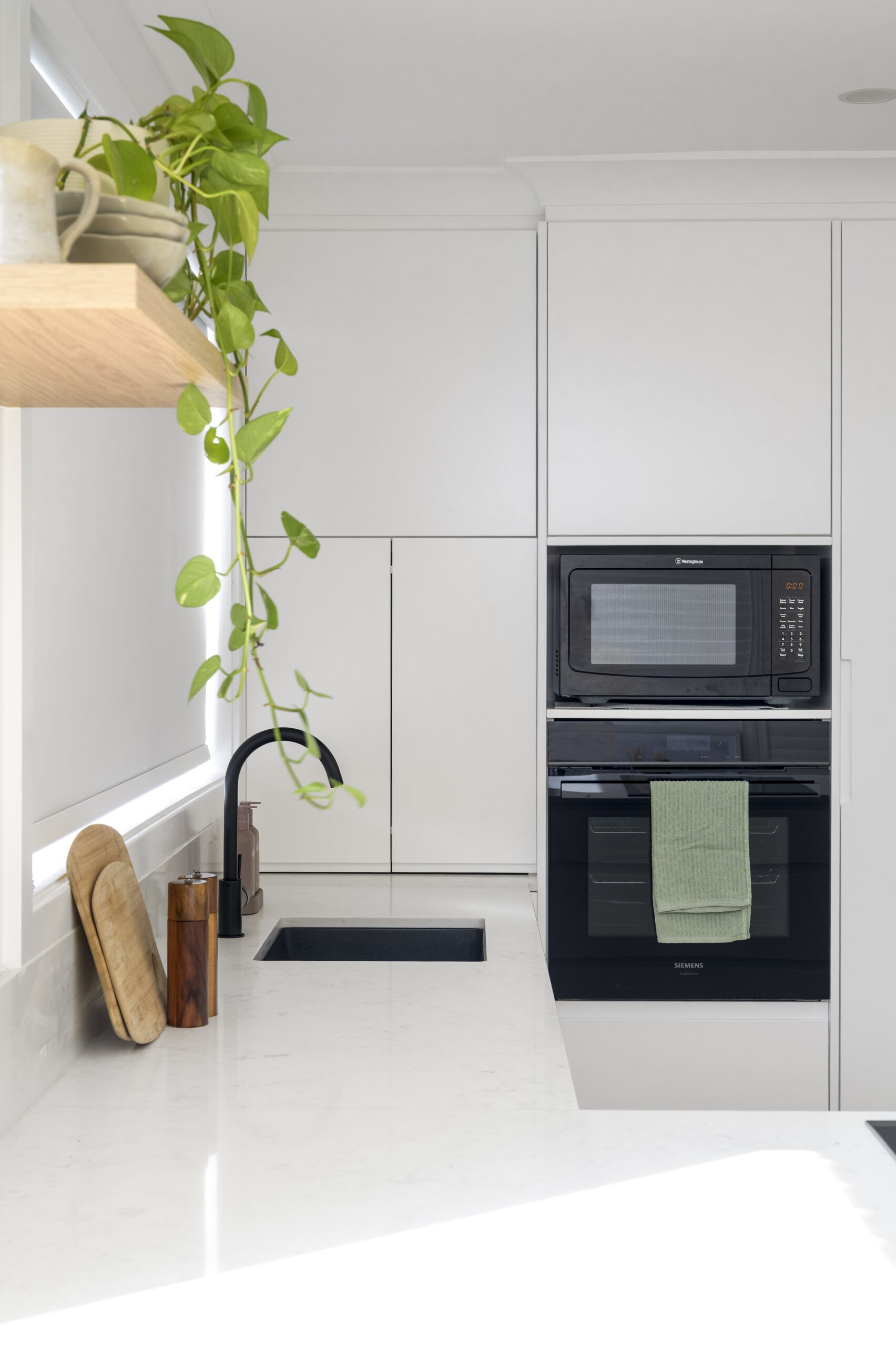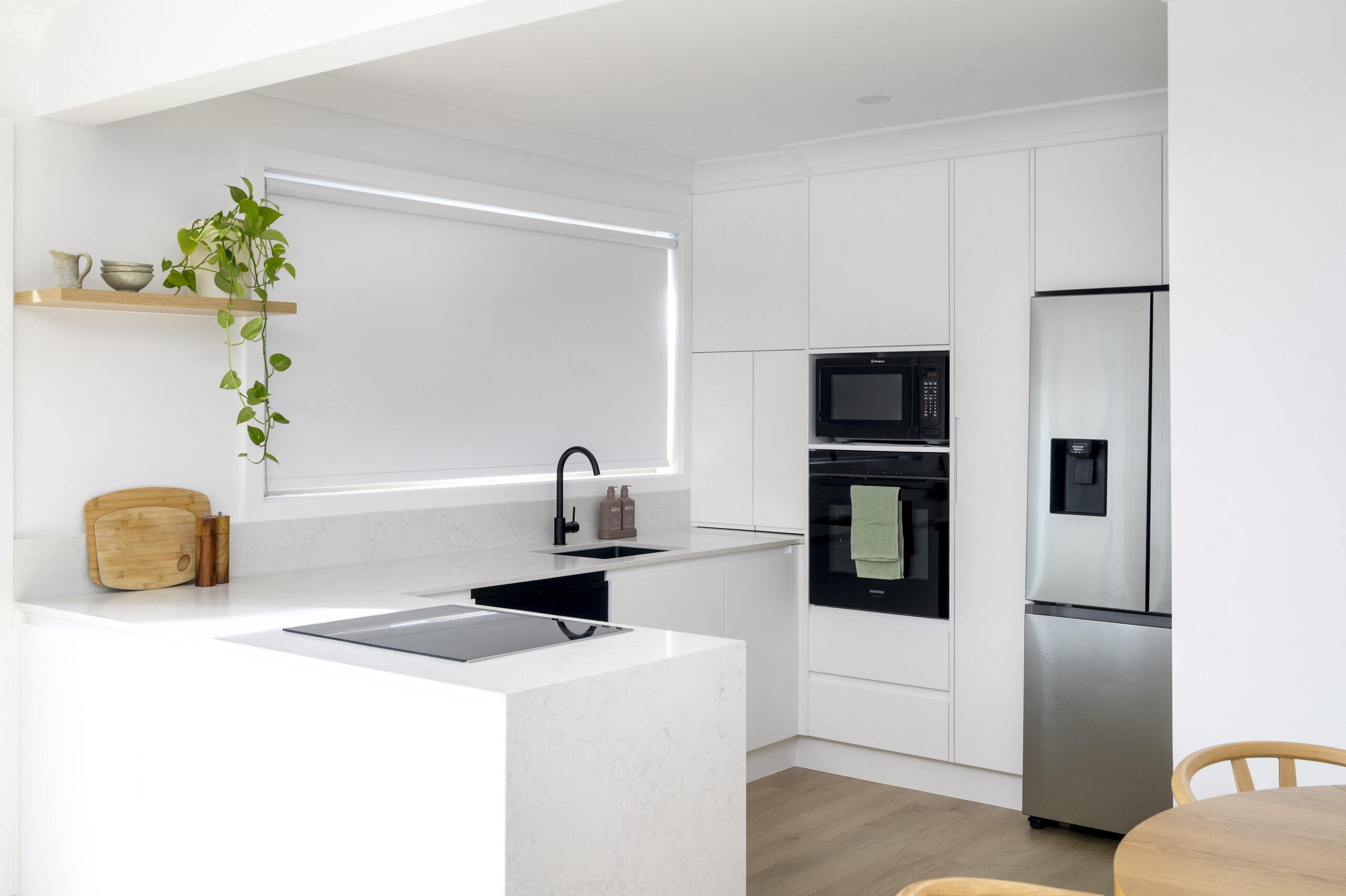 The renovation included a new kitchen, updated bathrooms and refreshed living areas, with finishes chosen for warmth, durability and low-maintenance living. Custom joinery was incorporated to simplify storage and keep the interiors feeling uncluttered and cohesive.